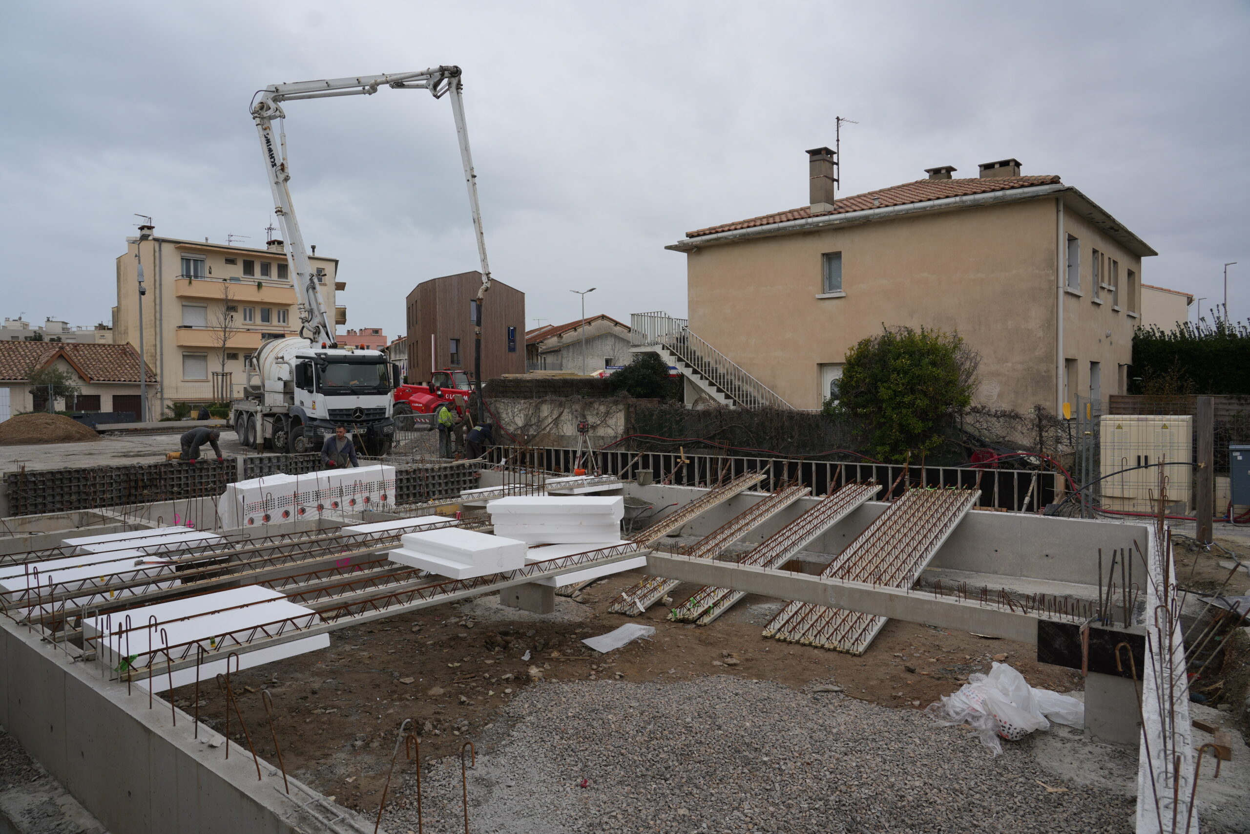 Des pieux ont été installés dans le sol afin d’ancrer solidement la structure dans les couches les plus résistantes du terrain. Ces éléments invisibles mais essentiels permettent de supporter le poids du futur bâtiment.
