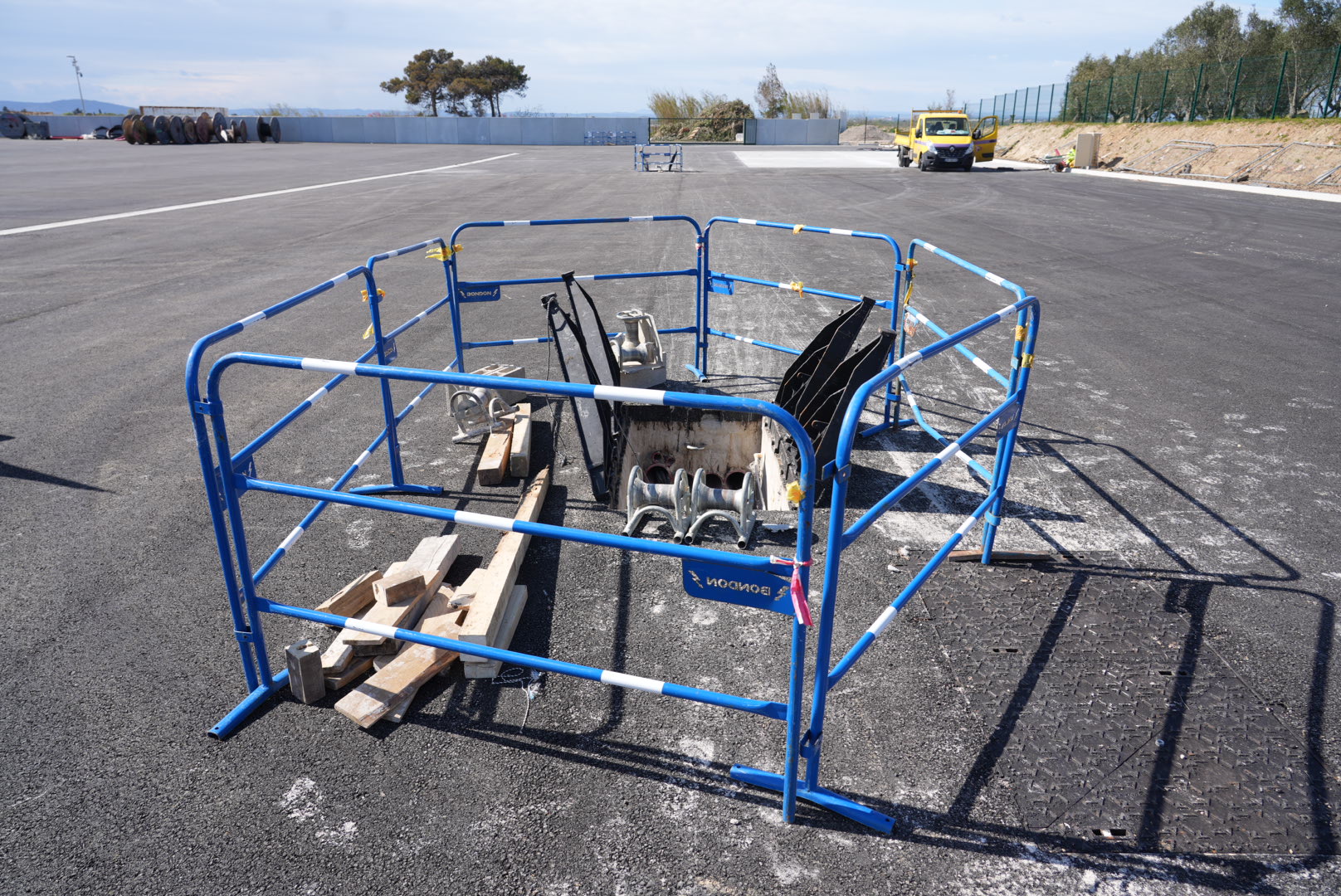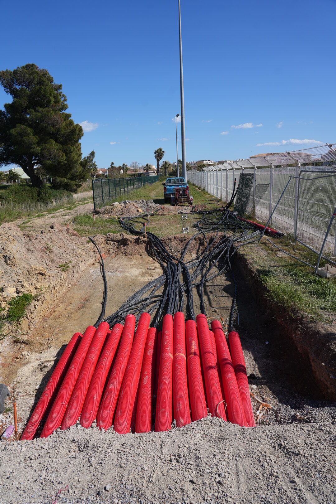 L’installation du réseau électrique, comprenant plus de 5 km de câbles pour l’alimentation générale, se poursuit activement tout comme le réseau eau potable.
