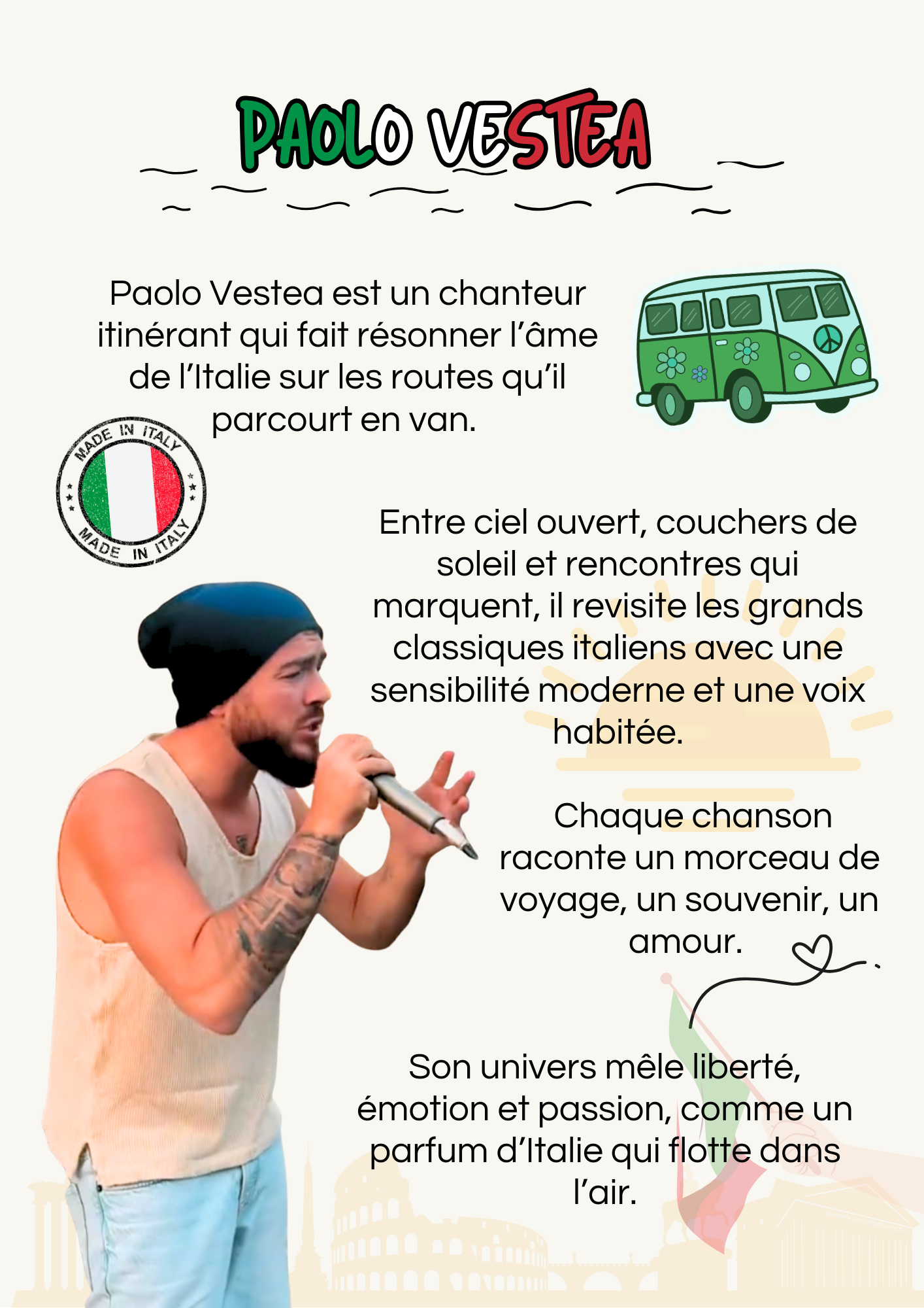 Entre ciel ouvert, couchers de soleil et rencontres qui marquent, il revisite les grands classiques italiens avec une sensibilité moderne et une voix habitée.