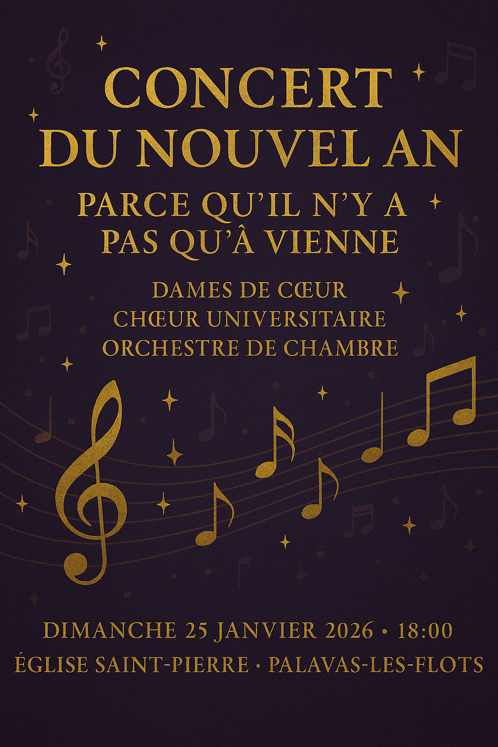 Laissez-vous emporter par la magie musicale du Concert du Nouvel An, intitulé « Parce qu’il n’y a pas qu’à Vienne », qui aura lieu le dimanche 25 janvier 2026 à 18h en l’Église Saint-Pierre de Palavas-les-Flots.